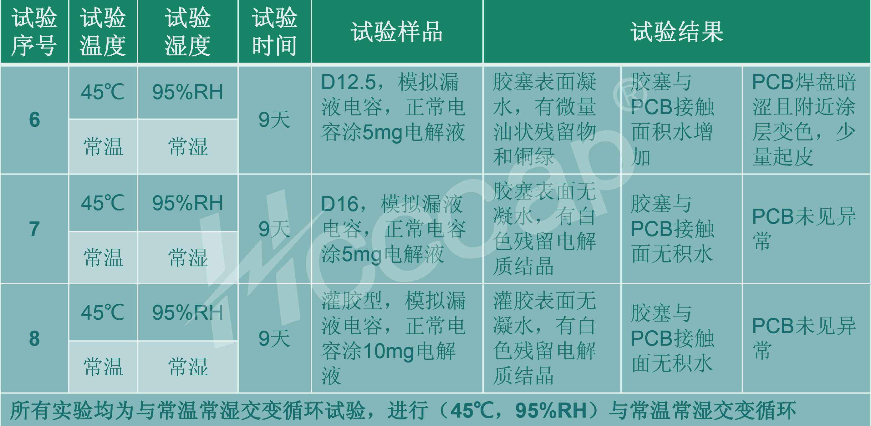 这说明,敞开条件下(超级电容及关联PCB未使用外壳进行密封),高温高湿或者凝露环境均不会短时导致“漏液”问题出现。